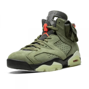 Air Jordan 6 Travis Scott "Cactus Jack": Ця версія характеризується мілітарі-зеленим (хакі) кольором, кишенею на бічній частині, підошвою, що світиться в темряві, і особливими логотипами "Cactus Jack". >